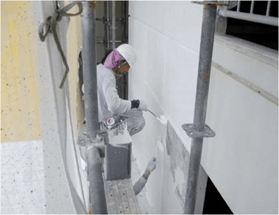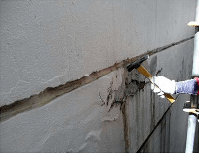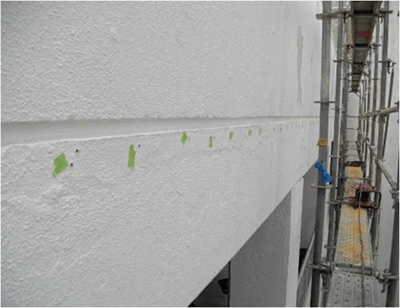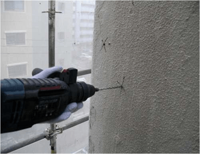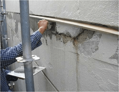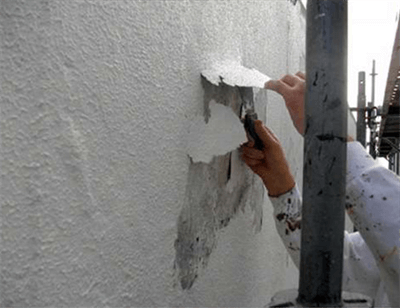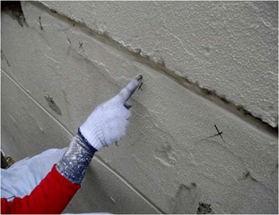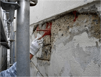 下地の浮きは外壁の劣化による不具合の1つです。浮きが生じることで雨等が浸入、剥がれからの断熱効果減等の様々な問題が発生します。そのような欠損が見られた場合、浮きの範囲と状態を調べエポキシ樹脂により補修を行います。